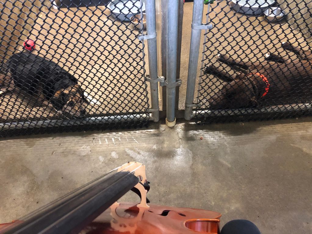 Very much miss playing live with the dogs getting as close to me as their kennels allow, listening to them sigh, sing along and play their squeaky toys and bowl cymbals. Walking with a cane 11 days post op and should soon be sitting with cello and dogs.